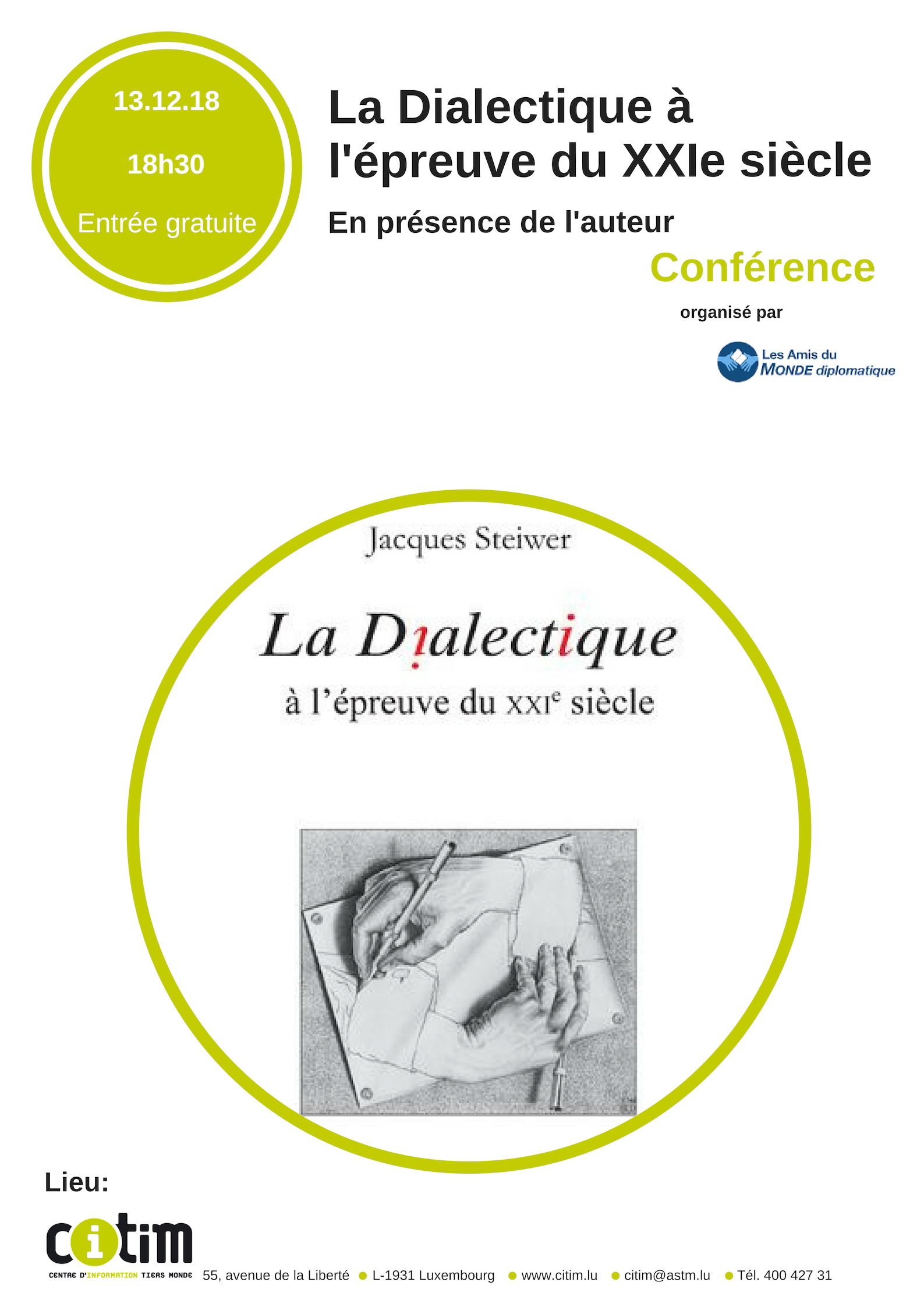 Le jeudi le 13 décembre, à 18 h 30, au CITIM, 55, avenue de la Liberté : « La dialectique à l’épreuve du XXIe siècle ». Avec le professeur Jacques Steiwer.
