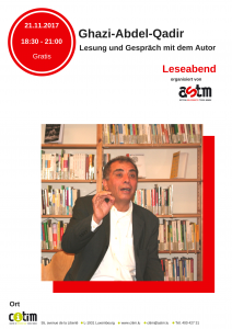Am 21. November wird der bekannte palästinensische Autor Ghazi Abdel-Qhadir in unserem Informationszentrum aus mehreren Büchern vorlesen.