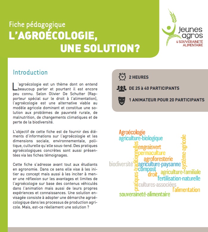 L’agroécologie est un thème qui revient souvent, pourtant il est encore peu connu. Selon Olivier De Schutter (Rapporteur spécial sur le droit à l’alimentation), l’agroécologie est une alternative viable au modèle agricole dominant et constitue une solution aux problèmes de pauvreté rurale, de malnutrition, de changements climatiques et de perte de la biodiversité. L’objectif de cette fiche est de fournir des éléments d’informations sur l’agroécologie et les dimensions sociale, environnementale, politique, culturelle qu’elle sous-tend. Des pratiques agroécologiques concrètes sont aussi présentées via les fiches témoignages. Cette fiche s’adresse avant tout aux étudiants en agronomie. Dans ce sens elle vise à les initier au concept mais aussi à les inciter à mener une réflexion sur les avantages et limites de l’agroécologie sur base des contenus véhiculés dans l’animation mais aussi de leurs propres expériences et connaissances.